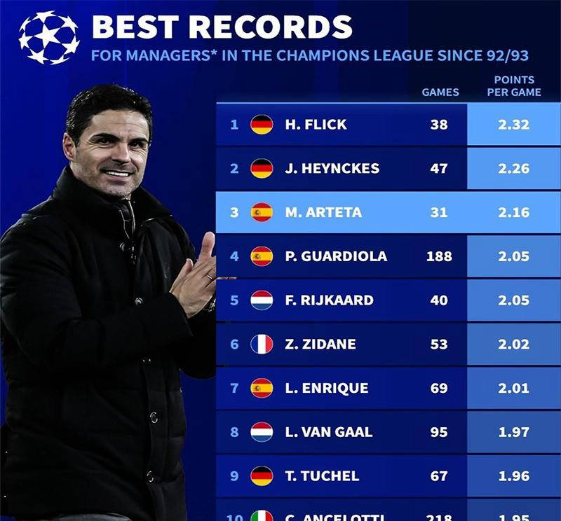 从数据角度来看,执教欧冠超过25场的主帅中,阿尔特塔以31场夺得67分,场均2.16分的成绩排名第三,甚至略高于曼城主帅瓜迪奥拉。这对于一位执教经历相对年轻的主帅而言,无疑显得尤为难能可贵。前两位分别是德国名帅弗里克——现任巴萨教头,以及曾带领皇家马德里和拜仁慕尼黑两次登顶欧冠的传奇老帅海因克斯。尤其是海因克斯,尽管参赛场次不多,却依然凭借着卓越的指挥能力,帮助两支球队时隔15年重夺欧洲最高荣誉。